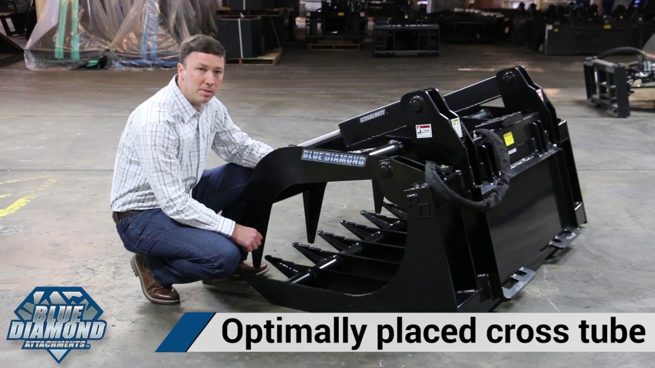 This new addition to the Blue Diamond grapples offers some great new features suggested by our customers! the new hose routing keeps the hoses out of the pinch area by running them internally through the left cylinder tower. The quick attach area has been made solid to protect the cylinder and lines on the hydraulic quick attach that many newer machines offer. Extra tubing in the grapple clamps prevents twisting and the one piece tines bucket tines no longer have a seam in the back of the grapple. This new design has made a great design even better!!