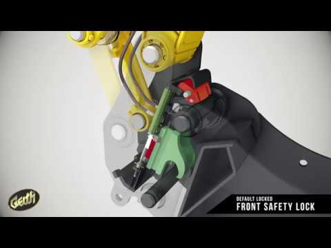 The Geith Hydraulic Quick Coupler Front Safety Lock is forced on by a spring which retains the attachment in case of misconnection
