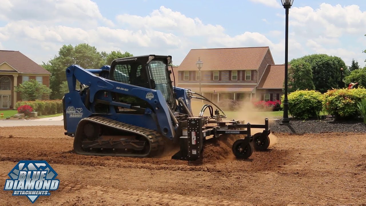 With skid steer machine sizes increasing in the industry, there is a need for a more powerful and durable power rake / soil conditioner attachment.  The Blue Diamond Power Rake is designed to power through jobs where others fail, and is set up for simple servicing.  The massive 6000 series motor and optimal drum size produce maximum torque, and the motor is kept out of the way, maximizing usable width in tighter areas.  Aggressive 2″ teeth are ideal for leaving a fresh seed bed with fewer passes. Our rental customers are finding this unit rents more often, is asked for by name and the customers love the increased productivity over all other brands!